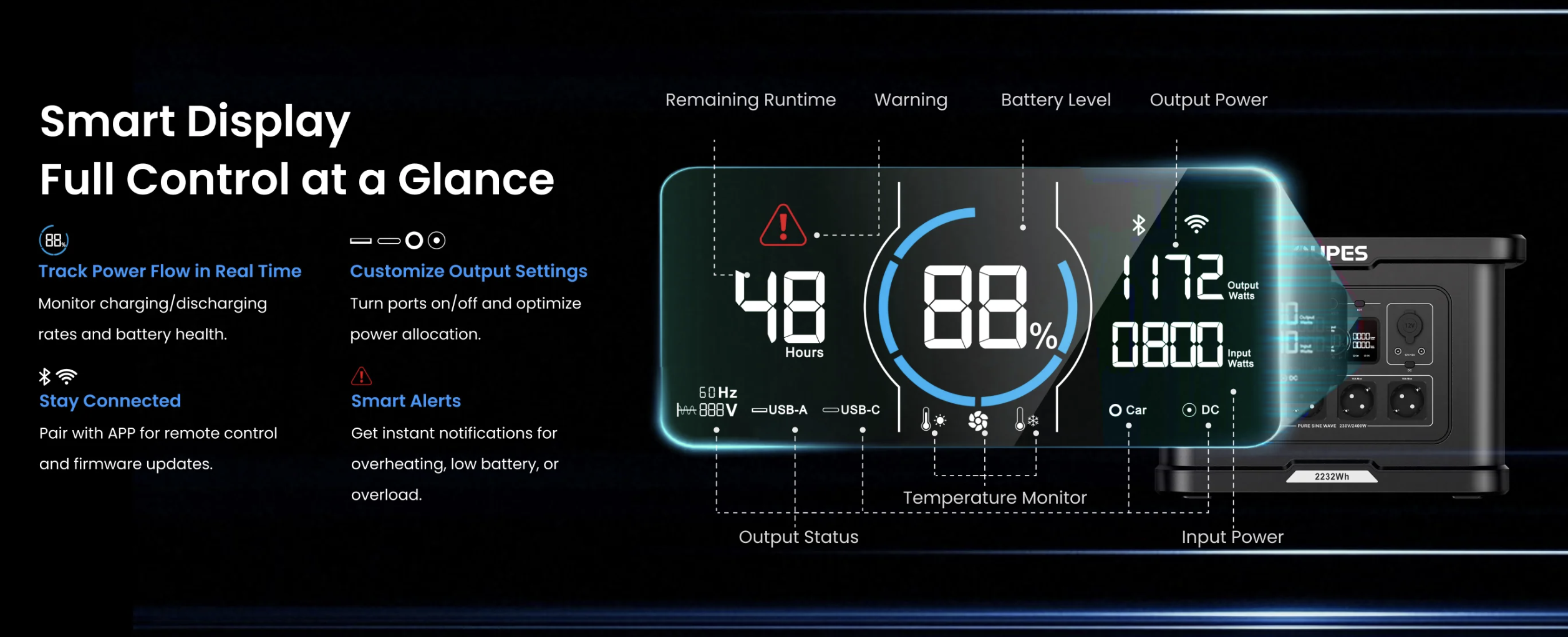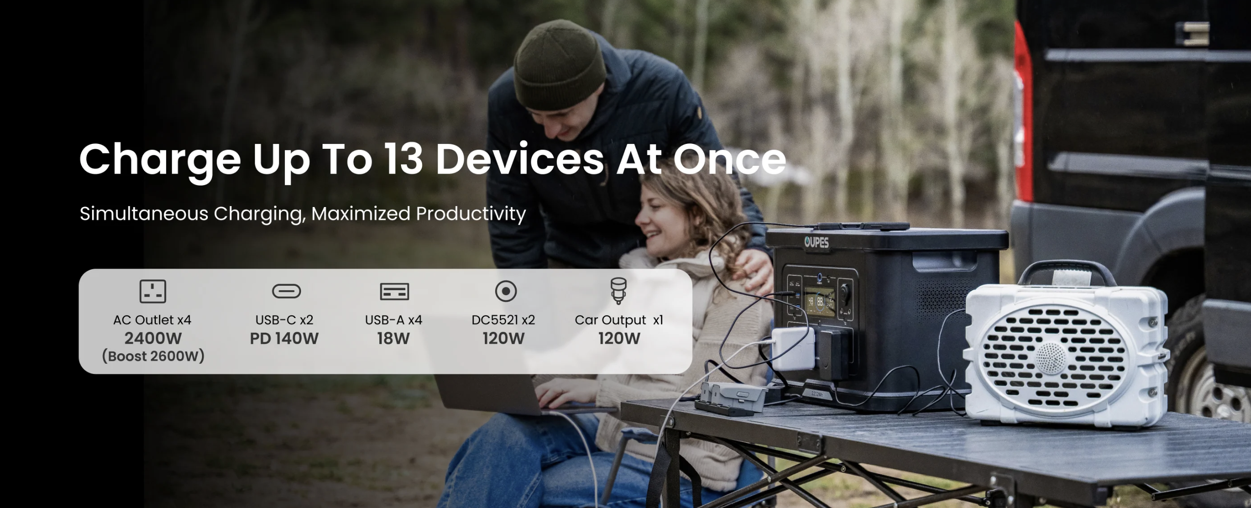 Модель пропонує 13 виходів, включаючи чотири AC-розетки по 120 В/20 А, чотири USB-A по 18 Вт, два USB-C по 140 Вт та DC-порти для автомобільних аксесуарів. Заряджання можливе від мережі з максимум 1400 Вт за 1,5 години, від сонячних панелей до 800 Вт або комбіновано до 2200 Вт для прискореного поповнення.