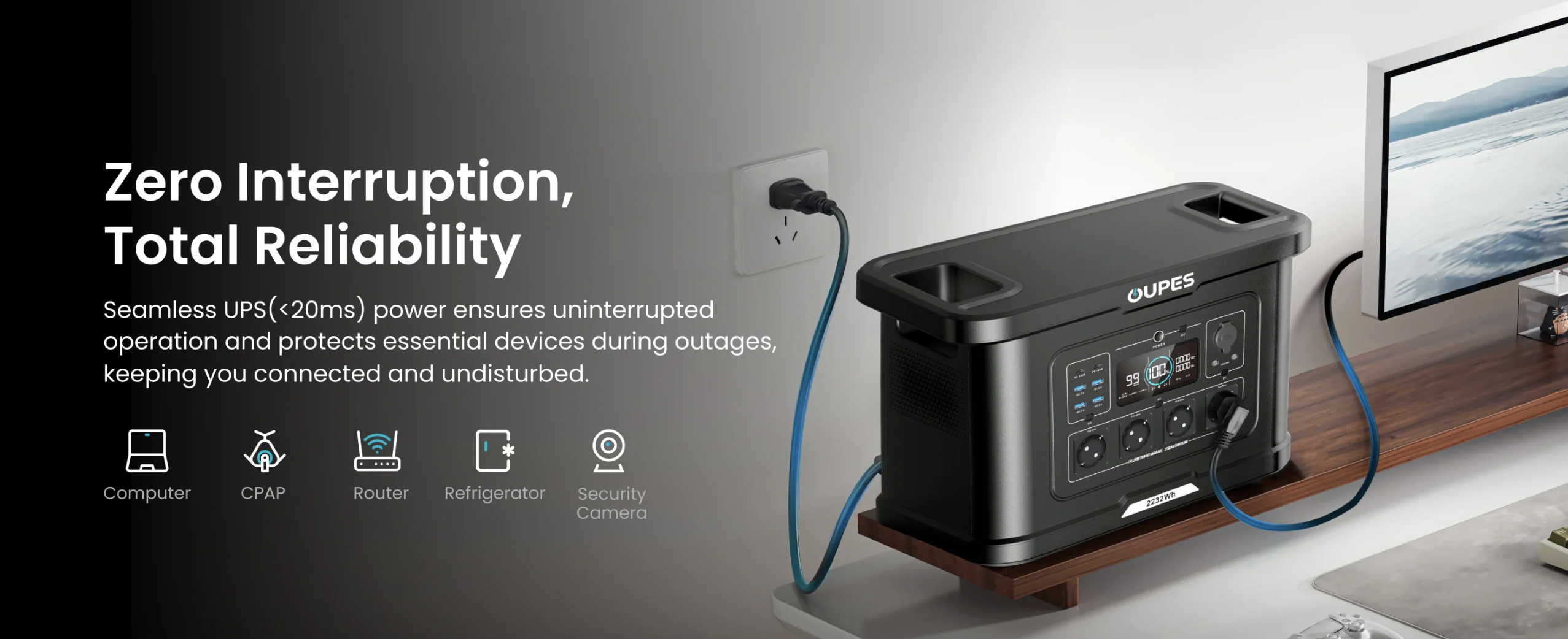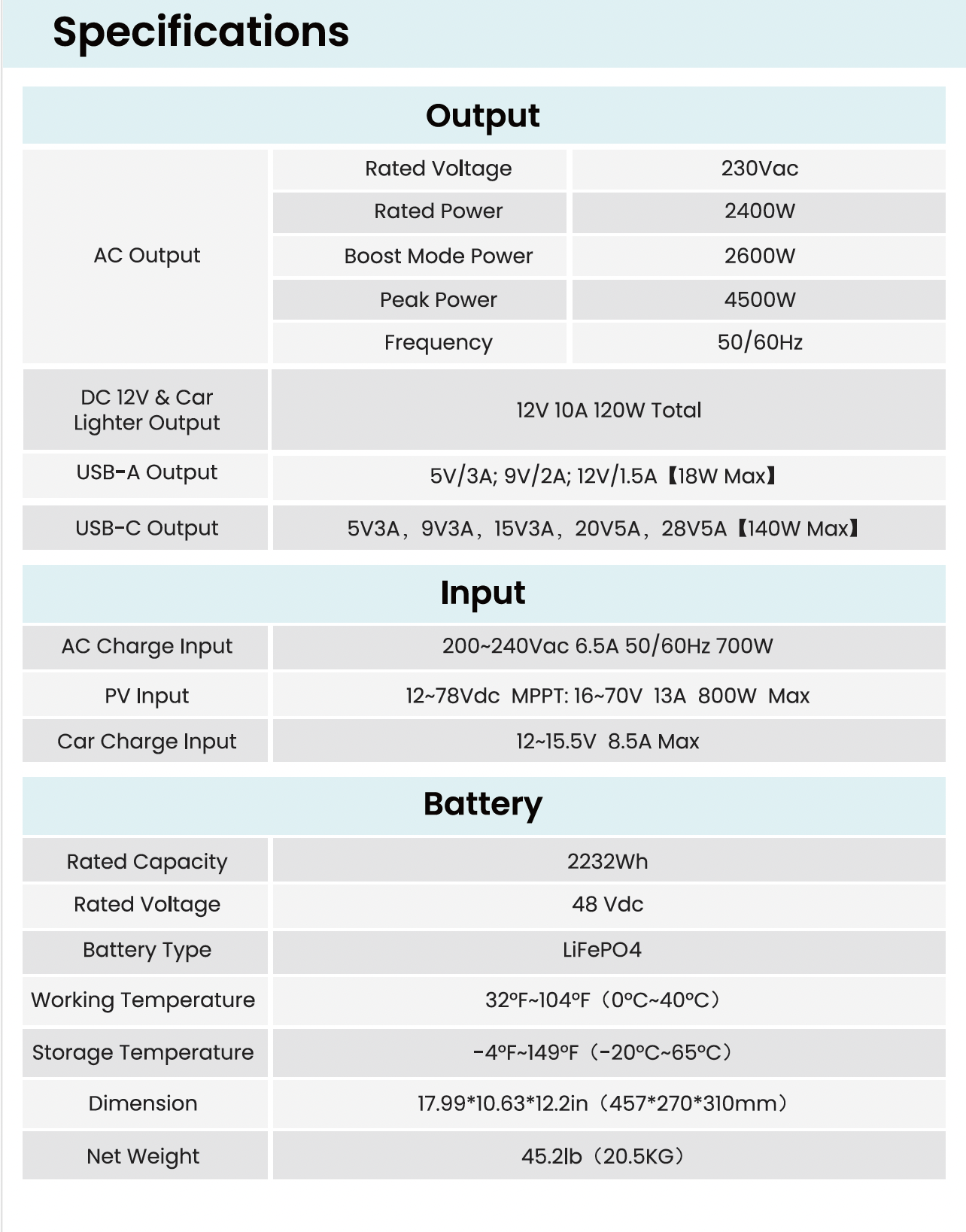З потужним інвертором на 2400 Вт у стандартному режимі та бустом до 2600 Вт при піковому навантаженні 4500 Вт пристрій генерує чисту синусоїду, що підходить для чутливої техніки. Ресурс акумулятора перевищує 3500 циклів до 80% залишкової ємності, гарантуючи довговічність та стабільність в експлуатації.